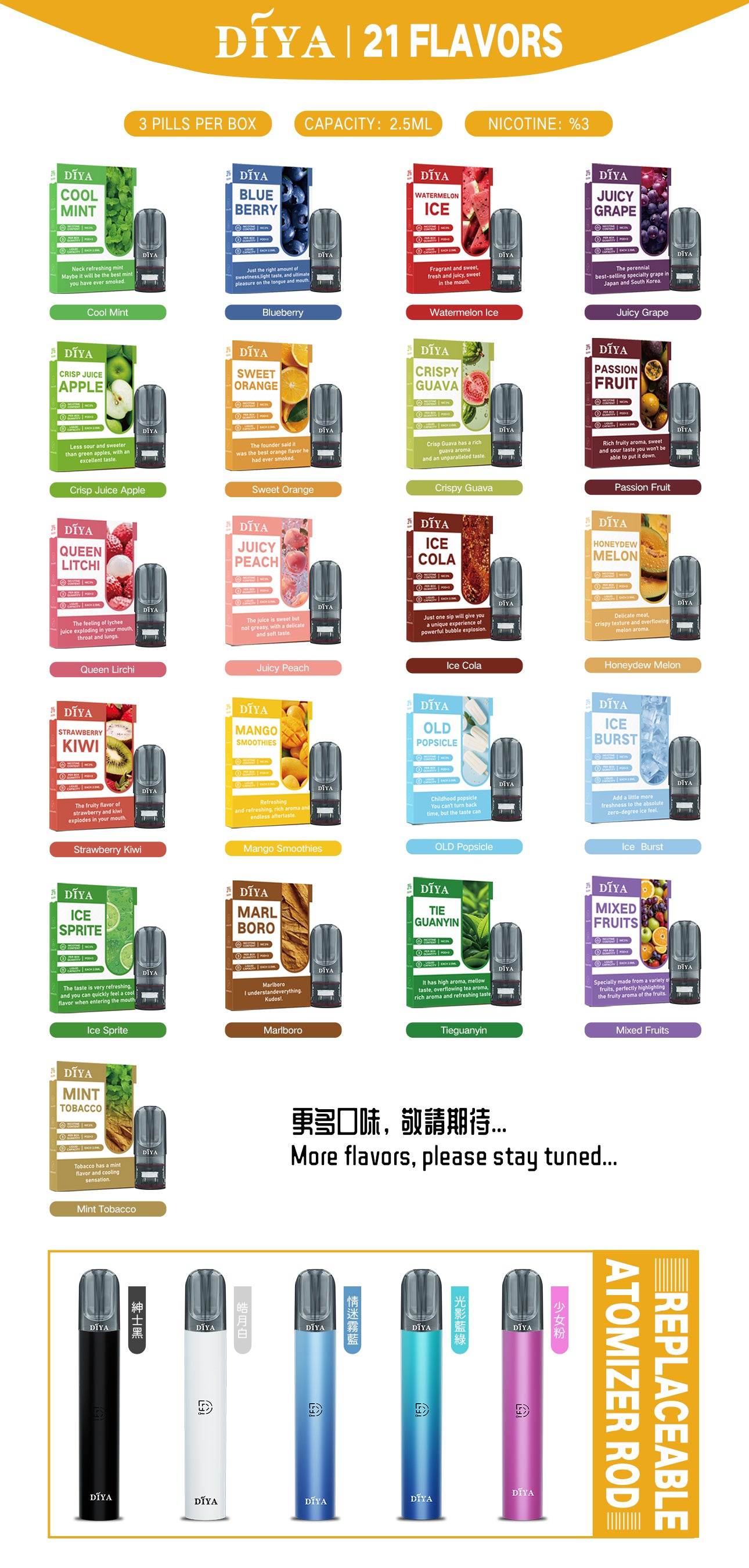 DIYA 煙桿通用市面上流行的多款一代煙彈,包括 RELX 和 SP2S,方便您隨時更換喜愛的口味與品牌,獲得最佳的吸煙體驗。